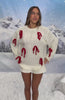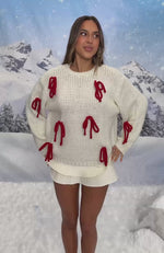 In Focus: Christmas Knitwear. The Candy Cane Crush Knit Sweater Cream features a classic crew neckline, slouched shoulders, and long sleeves with ribbed cuffs. This thick knit is finished with an oversized silhouette and statement oversized bow motifs scattered across the front. Style with a mini skirt for a merry blend of festive flair and relaxed style.