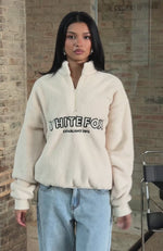 Embrace snuggle season in the Hard To Stay Focused Teddy Borg Zip Front Sweater in Cream. This cozy piece features a high collar, long sleeves with ribbed cuffs, and a quarter zip front. The firm ribbed hem band adds structure to the oversized fit, while the unlined teddy fabrication ensures warmth without bulk. An embroidered White Fox logo at the center front adds a subtle touch of street style. Pair with your go-to denim jeans and sunnies for the perfect chill weekend fit.