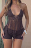 +49 loyalty pointsFringe forecast: 100%. The Here For Now Crochet Top Chocolate features thin self-tie halter straps, a scoop neckline, and a crochet fabrication for the ultimate boho vibe. Designed with a sheer floral crochet detail under the bust, statement fringe trim, and self-tie back straps for an adjustable fit, this backless style is made to stand out. Pair it with the matching shorts and cowboy boots for the perfect festival-ready look.