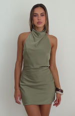 +69 loyalty pointsDance floor ready in the Just Small Talk Halter Mini Dress in Khaki. This backless beauty features adjustable halter straps with button closure, cowl neckline, a fully lined fitted silhouette and hidden centre‑back zipper with hook and eye closure. Pair it with gold accessories, a mini bag, and clear heels for maximum impact.