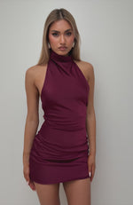 +69 loyalty pointsDance floor ready in the Just Small Talk Halter Mini Dress in Wine. This backless beauty features adjustable halter straps with button closure, cowl neckline, a fully lined fitted silhouette and hidden centre‑back zipper with hook and eye closure. Pair it with gold accessories, a mini bag, and clear heels for maximum impact.