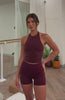 Step into your Pilates princess era with the Session Active Tank in Merlot. This backless halter-neck crop features a hook clasp closure and a fitted silhouette. Crafted from high-stretch fabric, it offers built-in bra support and removable padding. Pair it with the matching bottoms in Merlot for a coordinated look that transitions seamlessly from studio to street.