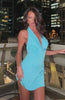 Own the spotlight in the She's Shining Embellished Mini Dress Blue. Features a halter neck style with self tie strap, front cowl detailing, lined, mini length, stretch material for an easy slip on design and stunning gem embellishments. Style with our Main Character Moment Heels for a look we can't get enough of!
