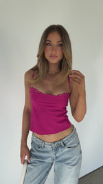 +69 loyalty pointsAdd a subtle touch of luxe to your outfit in the Tell Me All About It Top Fuchsia. Features a sewn in lace bra with thin adjustable straps and adjustable back closure, lightweight linen fabric, tie-up back detail and layered bra effect. Looks best paired with a low rise jean and mini bag for a dainty look!
