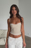 +69 loyalty pointsAdd a subtle touch of luxe to your outfit in the Tell Me All About It Top Oat. Features a sewn in lace bra with thin adjustable straps and adjustable back closure, lightweight linen fabric, tie-up back detail and layered bra effect. Looks best paired with a low rise jean and mini bag for a dainty look!